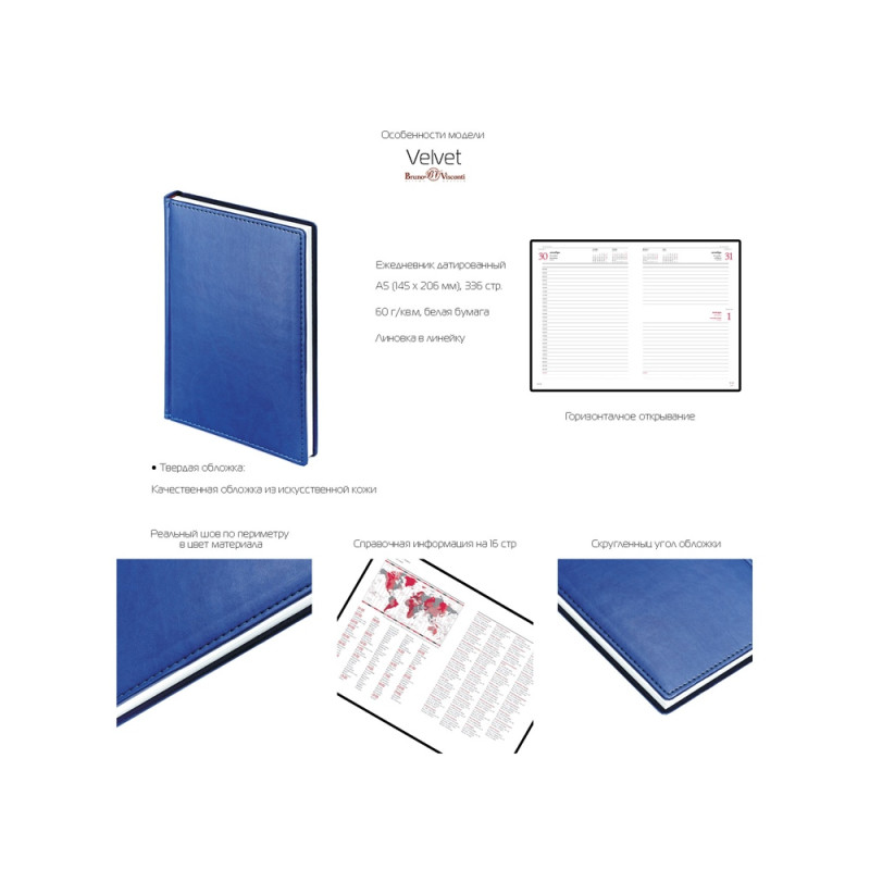 Переплет блока книжный. Цвет страниц белый с двухцветной печатью. Есть страница для личных данных, 16 страниц справочной информации, 19 страниц телефонного справочника и календарь на 2025-2026 года. Стандартный размер блока А5 (140 Х 200 мм).