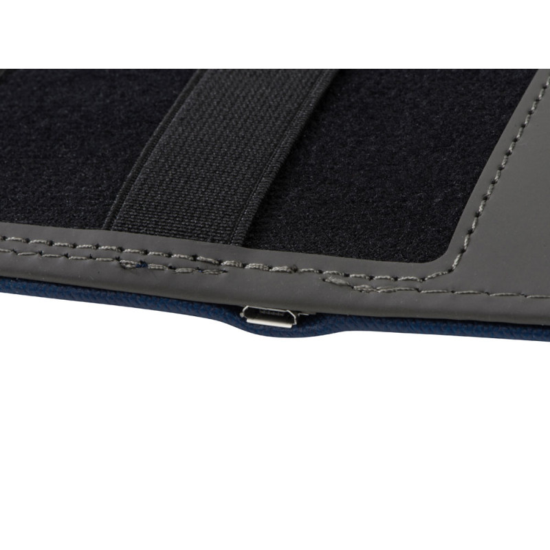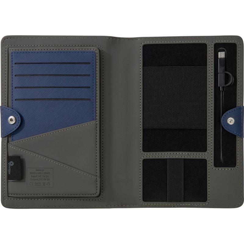 Органайзер закрывается на кнопку, имеет фиксирующие резинки для проводов и других мелочей, а также большой карман, отсек для паспорта и 4 — для карточек. Для проводной зарядки предусмотрен встроенный провод.